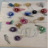 ・日時:9月13日(土) 10:00~16:00 ・場所:日本女子大学 80 年館A棟5 階被服学科物理学実験室 ・講師:青木芙紗江氏 ・テーマ:「針金で作る花のブローチ」 前半は、ブローチ、アクセサリーの成り立ちや進化など興味深いレクチャーを聞いて、後半は赤、青、金、銀などカラフルな針金を、安打組を基本に道具を使わないで、ブローチや指輪を作成しました。 |