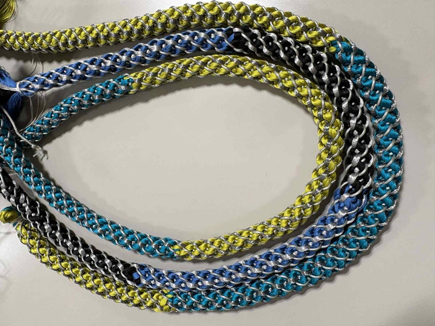 | ・開催日:10月28日(火)、29日(水) 10:00〜16:00 ・場 所:京都工芸繊維大学 工繊会館 ・講 師:Adrienne Gaskell氏 ・テーマ:A. Color Change Oimatsu(色変り老松) 老松組のベースとなる色を途中で変えることにより、独特な組模様を作る技法を学びました 色の変化をさせながら、レザー、金属糸も使用し全体に統一感のあるネックレスに仕上げました。Adrienne Gaskell氏のアイデアに感銘をうけつつ有意義なワークショップでした。 今回は上級者向けの技法であったため、初心者にはディスクを使用し、老松組を習得していただきました。 |